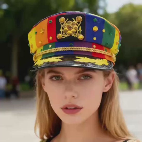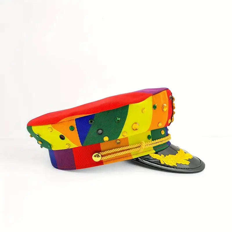 Elevate your summer parade look with this Sparkling Yacht Captain Hat, featuring vibrant rainbow rhinestones that catch the light from every angle. Designed for standout style, its glittering finish adds a festive touch while maintaining a classic captain silhouette. Perfect for parties and outdoor celebrations, this eye-catching accessory combines nautical charm with dazzling sparkle to ensure you lead the festivities with confidence and flair.